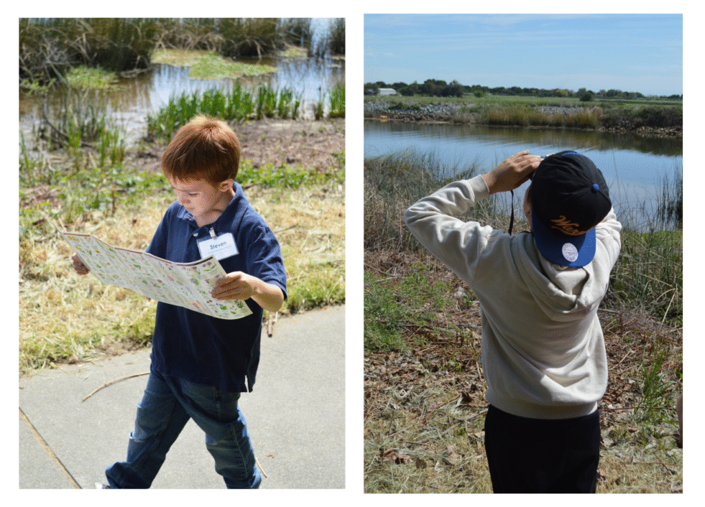 Environmentalists spent a lot of time looking through binoculars and using guides to identify nearby birds and native plants. Steven took it upon himself to identify every single tree in the area! He moved from one tree to another, plucking a fallen leaf or two from the ground before returning to the path to identify it using his native plant guide. Using the fallen leaves, he was able to identify many species “I think this is a white elder tree,” said Steven. “This is a coastal live oak! I wonder if it has acorns at this time of year?”