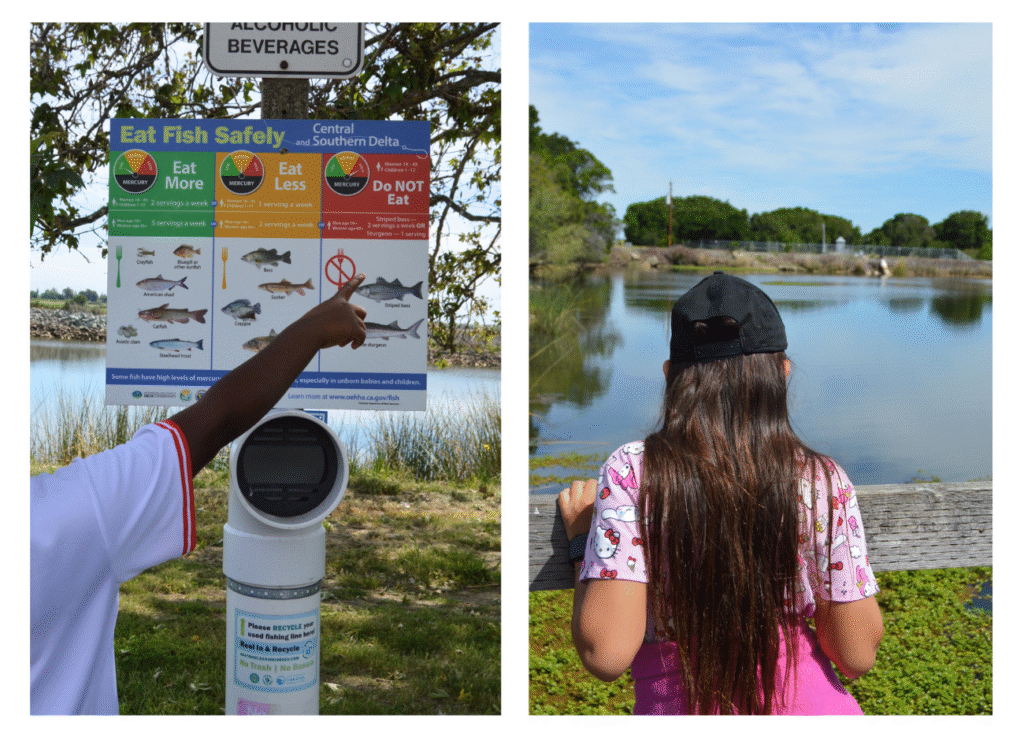 At the nearby dock, our young Environmentalists spotted an ‘Eat Fish Safely’ sign, detailing the types of fish from the slough that are safe to eat, and the recommended quantities a person can safely consume. Students buzzed with excitement, having just completed their Safe Bay Bay/Delta Fishing and Cooking Environmental Action Project with KftB. “This looks like the chart we used to teach our parents which fish are safest to eat!” said Ja’Dahya.