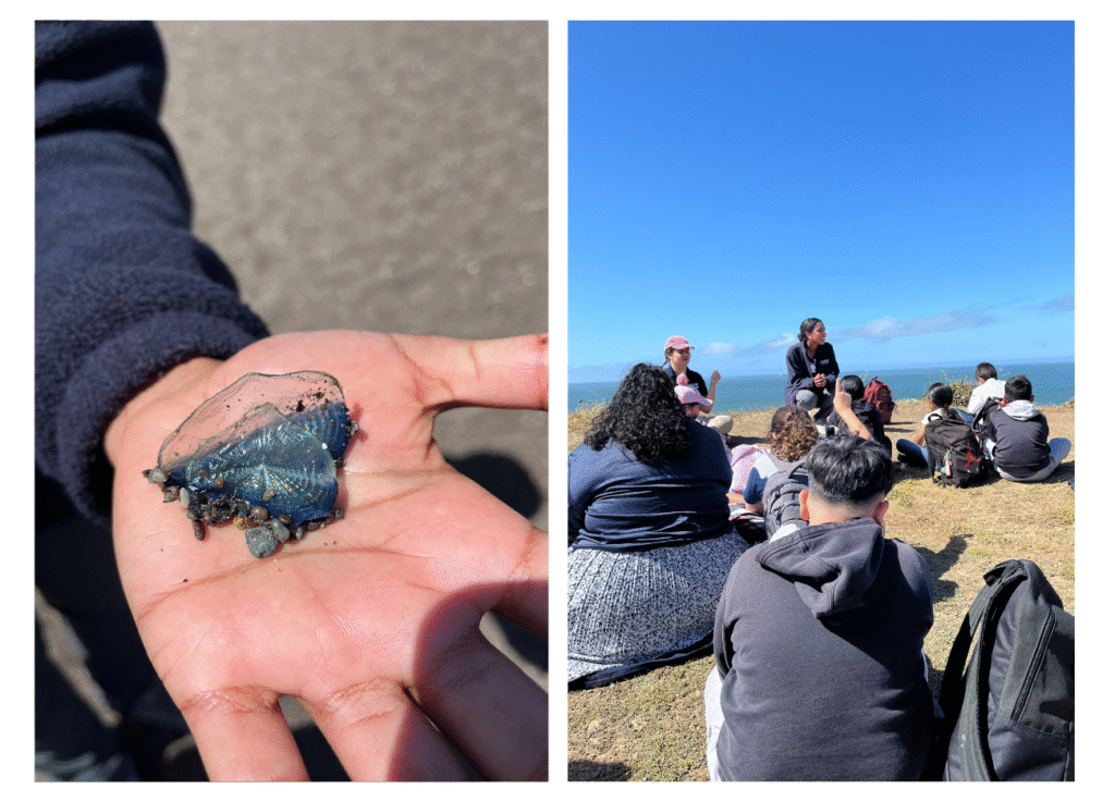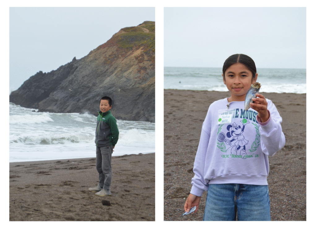 After lunch, the young Environmentalists explored Rodeo Beach in search of a nature artifact to share. Students scoured the beach searching for their artifacts. King discovered the plastic-like remains of a Velella velella, half buried in the sand. “What is this? It looks like plastic!” said Daisy. “That’s a by-the-wind sailor. Also known as Velella velella. They are like jellyfish! They float on the surface of the ocean, propelled by wind and currents. When they’re alive, they are bright blue. When they die, they leave behind these plastic-like remnants,” said Ms. Sabreena. To conclude the day’s activities, students shared an artifact or an observation from the trip. “I found a big blue mussel shell with a bunch of lichen and barnacles growing on it,” said Emanuel. “I found pollution!” said Dulce, holding up a broken plastic toy shovel. “I saw a rock shaped like a heart,” said Emilio. “I found a feather! I think it’s from a California Gull,” said Julieta.