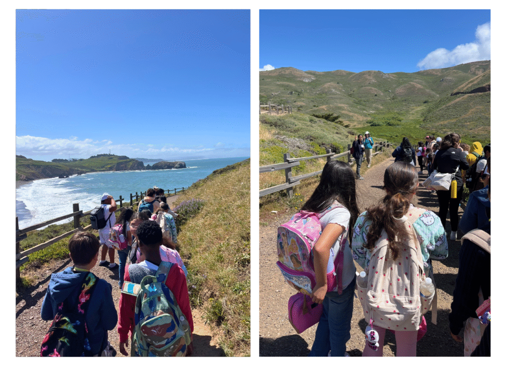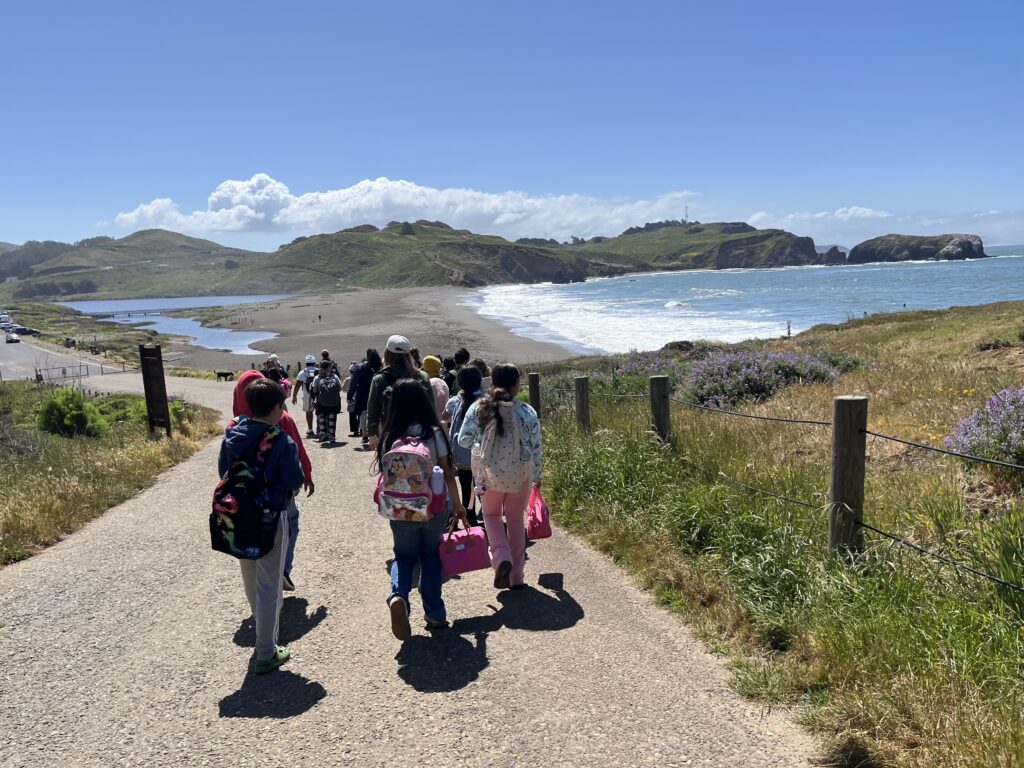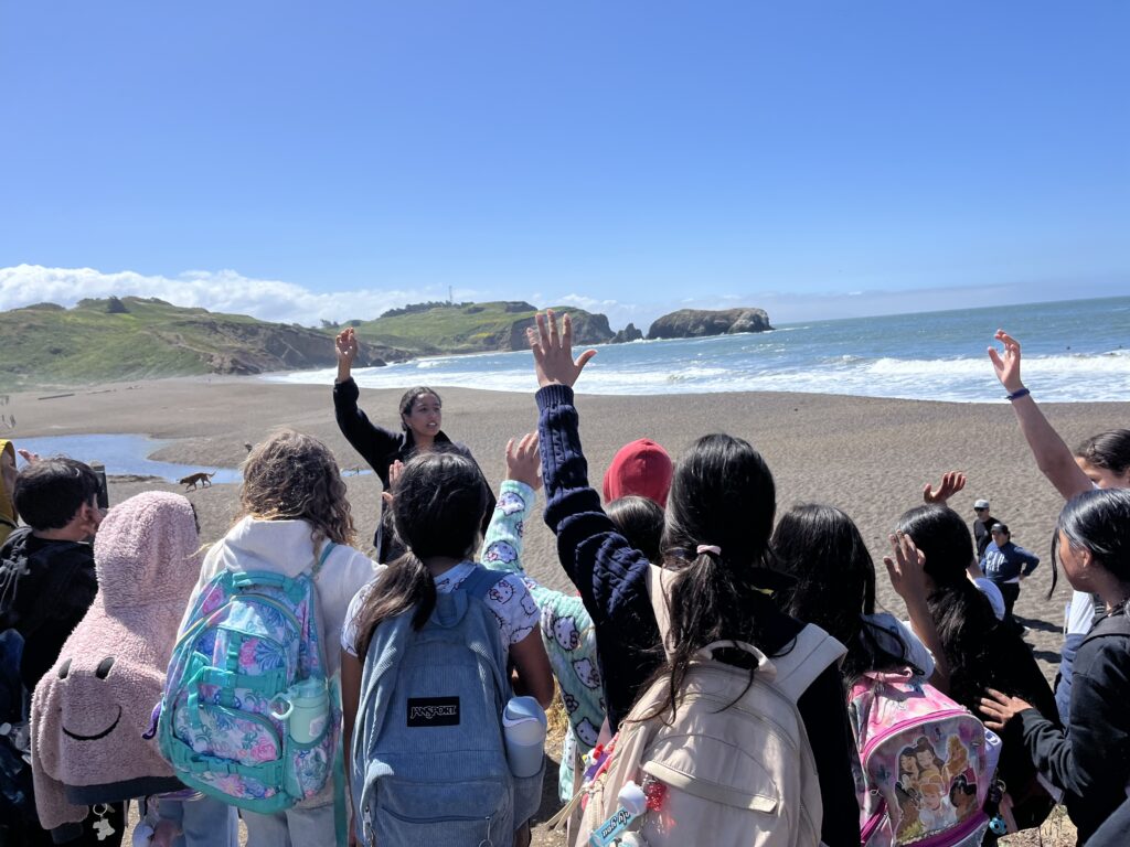 After everything they learned in their watershed lessons and bay field trips, students from Washington Elementary School were ready to explore the ocean beach and marine ecosystems at Rodeo Beach in the Marin Headlands. They had lots of exciting questions! “Are we going to hike up there?” Giancarlos asked, pointing to the sprawling headlands and coastal hills, cloaked in wisps of fog. “Are we going to see lots of animals today?” wondered Mariela. After some initial beach explorations and a snack break, Ms. Sabreena called students’ attention to their surroundings. “What is the body of water that you see behind me?” asked Ms. Sabreena. “The Pacific Ocean!” exclaimed Amari. “Today, we’re going to hike along the coast and explore this ocean beach. We’re going to see lots of cool birds and native plants!” she explained. Ms. Sabreena explained the rules of ‘Leave No Trace’ and encouraged students to leave their environment better than they found it.