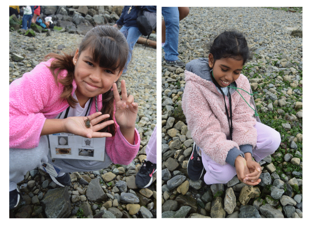 Students were thrilled to investigate intertidal organisms during their rocky shore investigation. “Who can tell me what an ‘invertebrate’ is?” asked Ms. Anaïs. “An invertebrate means an animal with no backbone,” shared Santi. “That’s right! Does anyone know what kinds of invertebrates we might find down on the rocky shore?” asked Ms. Anaïs. “Crabs!” suggested Julius. “Jellyfish!” said Mariam. “Remember, use quiet, soft voices and movements, watch where you’re stepping and stay low to the ground so that you don’t scare or injure any organisms.”