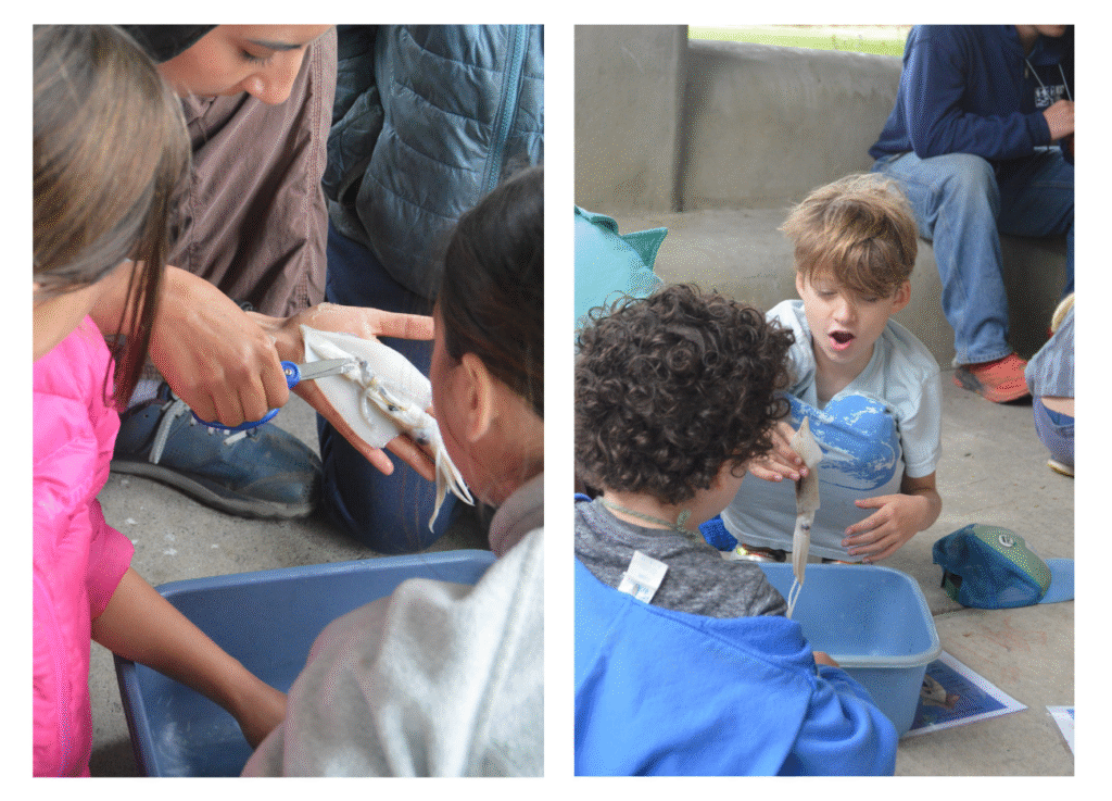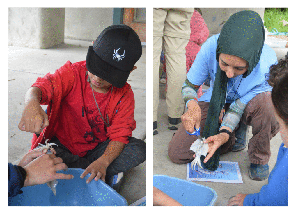 Campers had the exciting opportunity to dissect squid to learn more about this unique organism’s anatomy and adaptations. “Why do you think scientists dissect things?” asked KIDS for the BAY Camp Leader Neda Ibrahim. “Scientists take things apart to learn more about them, to understand how their bodies work or to see how they lived,” suggested Olivia.